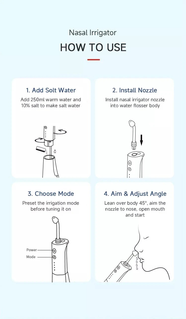 Tehokas nenän huuhtelu: Sähkökäyttöiset nenähuuhtelulaitteet huuhtelevat nenäkäytäviä tehokkaasti ja perusteellisesti, mikä auttaa huuhtelemaan pois liman, allergeenit ja roskat tehokkaammin kuin manuaaliset menetelmät. Mukavuus: Sähkökäyttöiset nenähuuhtelulaitteet tarjoavat kätevän ratkaisun tehollisen toiminnan ja säädettävien asetusten ansiosta. nenän huuhtelutekniikkaan, mikä säästää käyttäjien aikaa ja vaivaa verrattuna manuaalisiin huuhtelutekniikoihin. Mukauttaminen: Sähköisten nenähuuhtelulaitteiden säädettävät asetukset antavat käyttäjille mahdollisuuden mukauttaa kastelukokemustaan yksilöllisten tarpeidensa, mieltymyksiensä ja mukavuustasonsa mukaan.