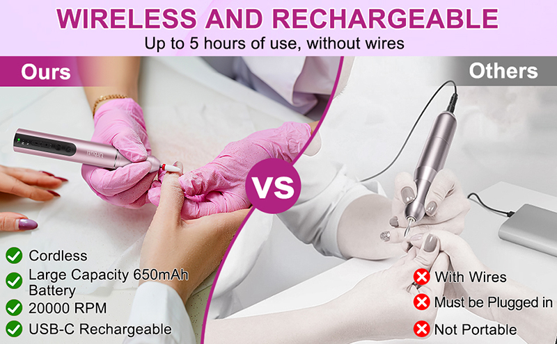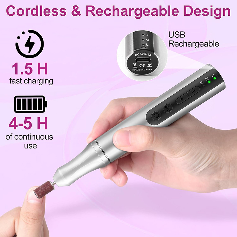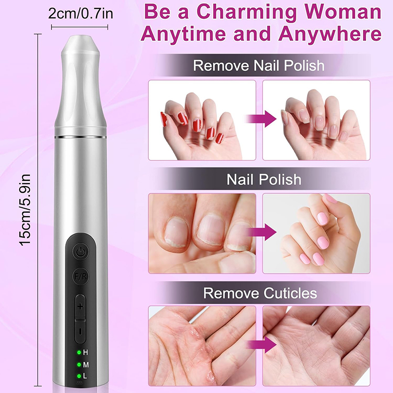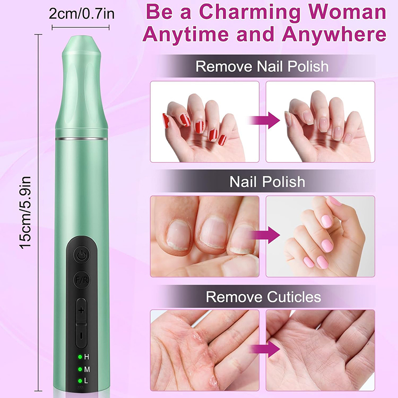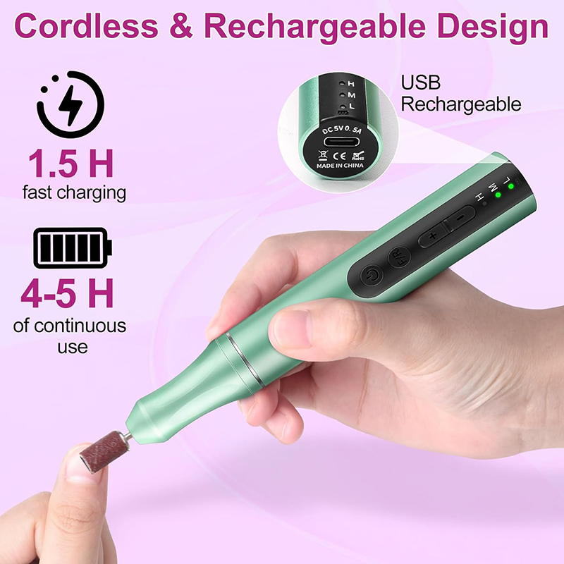 akryylikynsien naulaporat on suunniteltu kevyiksi (85 g) ja mahtuvat kukkaroon tai vaatteiden taskuun. Sen mukana tulee myös USB-latauskaapeli, joka voidaan helposti liittää mihin tahansa USB-laitteeseen latausta varten, joten voit nauttia kynsien hoidosta missä ja milloin tahansa.