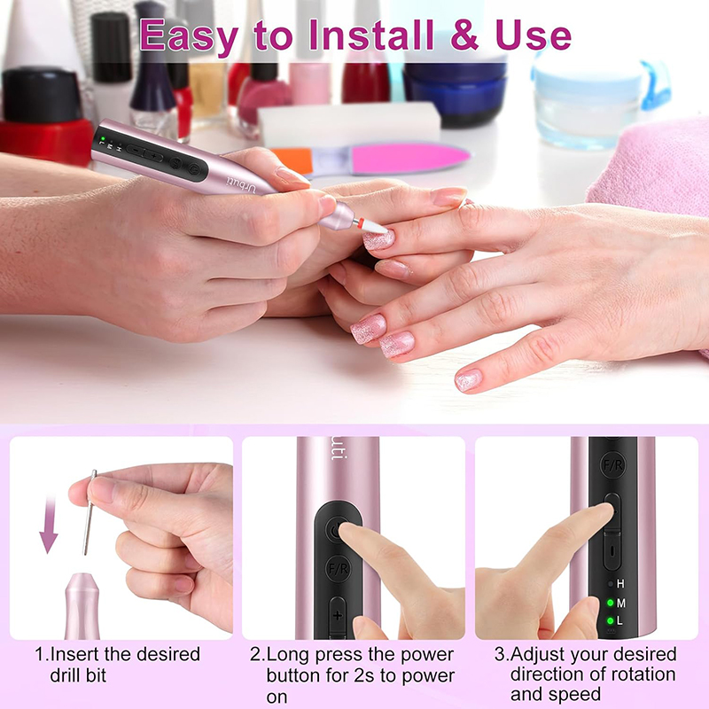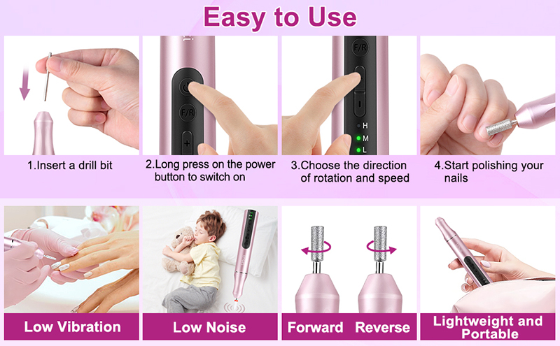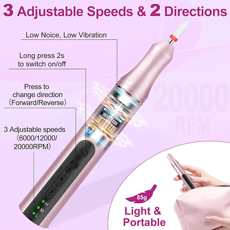 Kynsiviilat Professional on suunniteltu kolmella nopeudella 6000-12000-20000, paina vain lyhyesti + tai - painiketta lisätäksesi tai vähentääksesi nopeutta. Helppo säätää nopeutta ja säästää aikaa kynsien teroittamisessa. Poran suuntaa voidaan helposti muuttaa painamalla F/R-painiketta, ihanteellinen vasenkätisille, mestarikynsitaiteilijoille tai aloittelijoille kynsienhoitoon.