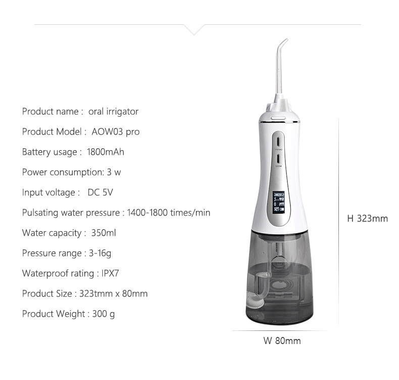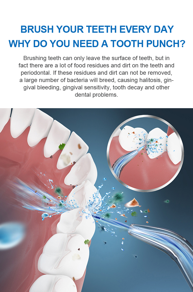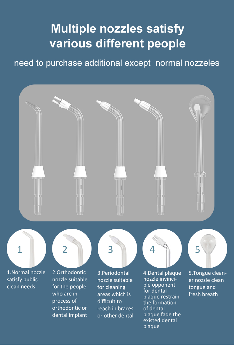 Tämä vesihammastippu tuottaa korkean vedenpaineen pulsseja 1400-1800 kertaa minuutissa poistaen tehokkaasti 99,9 % plakista hampaiden syväpuhdistusta varten. Tämä vesihammastukka hieroo ikeniä, edistää verenkiertoa ja hoitaa suuongelmia, kuten pahanhajuista hengitystä, oikomishampaat
