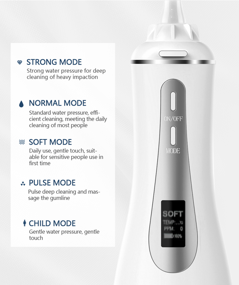 Amerikkalaisen hammaslääkäritiimin ammattimaisesti arvioima flosserimme tarjoaa viisi kätevää tilaa, jotka sopivat 99 % eri ikäryhmien erilaisiin tarpeisiin ja takaavat samalla optimaalisen suorituskyvyn ja käyttöiän. Sen ergonominen kahva ja 6 vaihdettavaa suutinta varmistavat mukavan ja monipuolisen käyttökokemuksen. Se on huomaavainen lahja syntymäpäiville, joulun kiitospäivänä, ystävänpäivänä isän äitienpäivänä tai läheistesi suun terveydestä huolehtimiseen