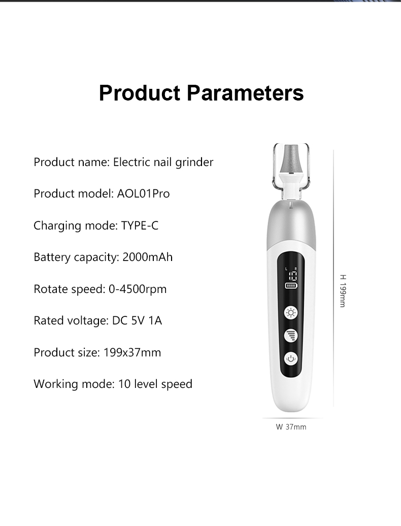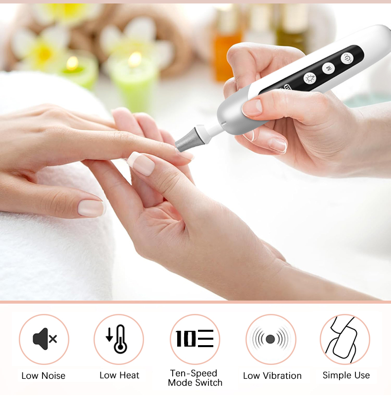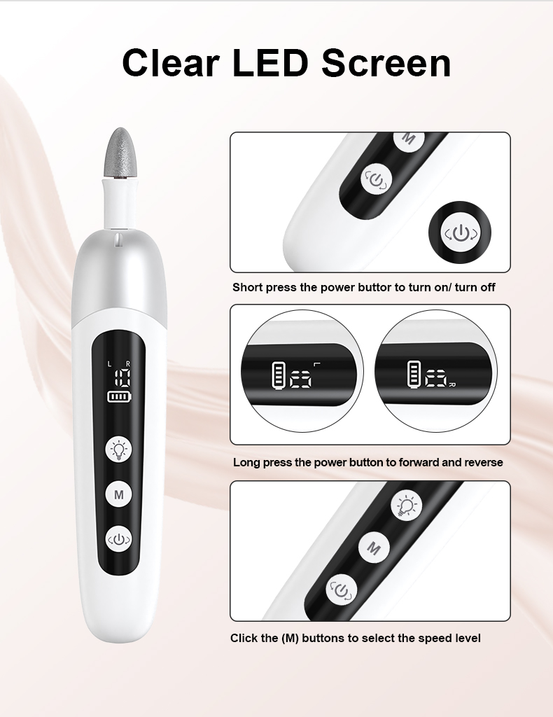 - INNOVATIIVINEN LED-NÄYTTÖ: Selaa saumattomasti haluamasi asetukset helposti. LED-näyttö näyttää akun tilan, nopeustoivomukset ja pyörimisasetukset vaivatonta käyttöä varten. Sähköisessä kynsiviilakoneessa on myös integroitu LED-valo, joka valaisee käsien ja jalkojen alueita