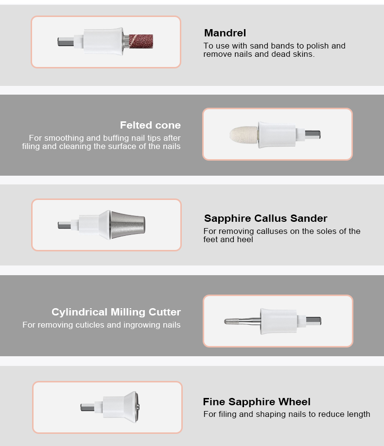 - 10 NOPEUSASETUSTA: Koe sähköisen manikyyrisarjamme teho, jossa on 10 progressiivista nopeusasetusta ja monipuoliset kierrokset myötä- ja vastapäivään. Kynsipora takaa tarkan viilaamisen paksuihin sormen- ja varpaankynsiin ja on räätälöity kaikille ihotyypeille, myös diabeetikoille.