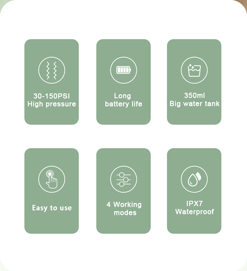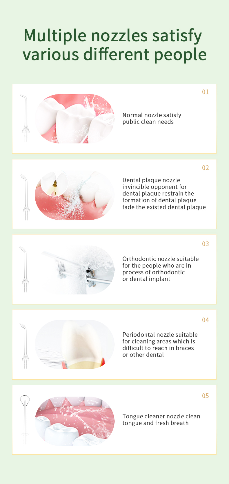 Tämä vesihammastippu tuottaa korkean vedenpaineen pulsseja 1400-1800 kertaa minuutissa poistaen tehokkaasti 99,9 % plakista hampaiden syväpuhdistusta varten. Tämä vesihammastukka hieroo ikeniä, edistää verenkiertoa ja hoitaa suuongelmia, kuten pahanhajuista hengitystä, oikomishampaat