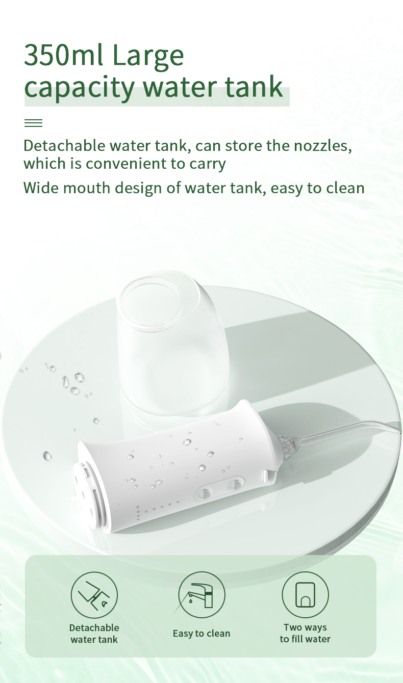 Tässä vesihammaslangassa on paranneltu 350 ml:n vesisäiliö, joka on kaksinkertainen muihin vanhoihin malleihin verrattuna, mikä eliminoi toistuvan täyttötarpeen ja tekee suun puhdistamisesta mukavampaa ja tehokkaampaa.