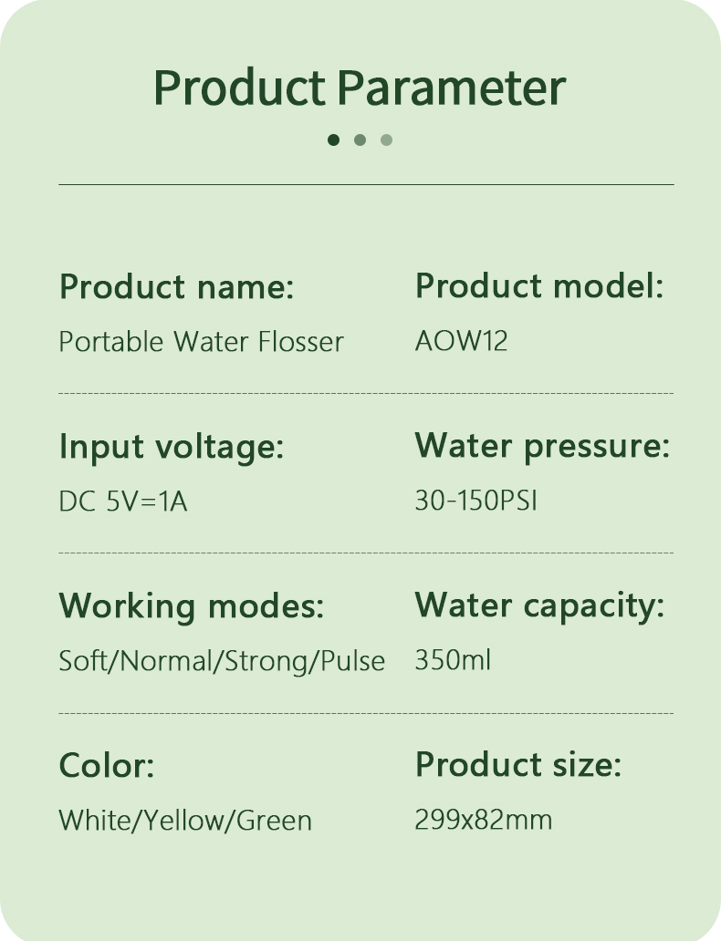 Amerikkalaisen hammaslääkäritiimin ammattimaisesti arvioima flosserimme tarjoaa viisi kätevää tilaa, jotka sopivat 99 % eri ikäryhmien erilaisiin tarpeisiin ja takaavat samalla optimaalisen suorituskyvyn ja käyttöiän. Sen ergonominen kahva ja 6 vaihdettavaa suutinta varmistavat mukavan ja monipuolisen käyttökokemuksen. Se on huomaavainen lahja syntymäpäiville, joulun kiitospäivänä, ystävänpäivänä isän äitienpäivänä tai läheistesi suun terveydestä huolehtimiseen